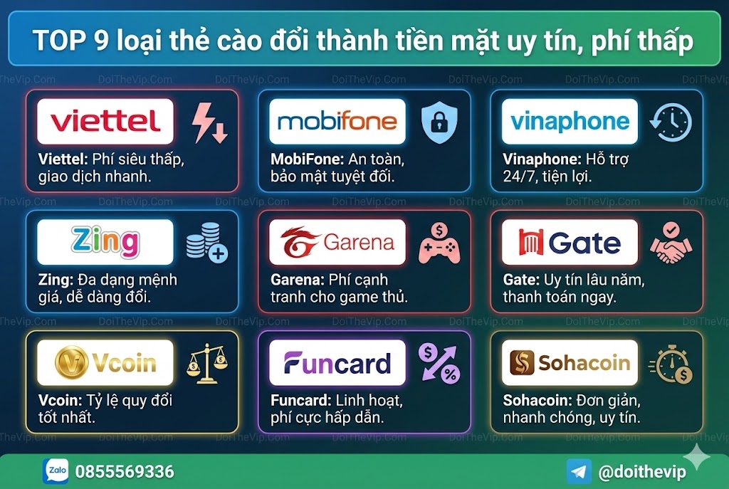 DoiTheVip.Com hỗ trợ đổi thẻ của nhiều nhà mạng và thẻ game phổ biến như Viettel, Mobifone, VinaPhone, Vietnamobile, Garena, Zing kèm theo tính năng rút tiền tự động nhanh chóng, tiện lợi.